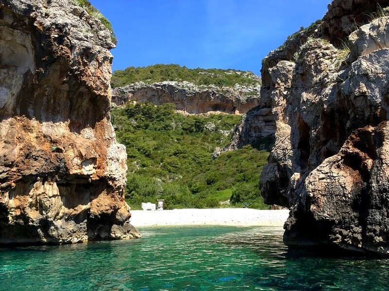 If the weather holds, anchor the next morning in Stiniva Bay, a limestone amphitheatre hidden behind a narrow sea gate. The entrance is so tight it feels like threading a secret — the cliffs curve protectively around a white pebble beach, and the sea inside turns impossibly clear, shifting between jade and ink-blue. Think of that Greek island with the shipwreck — only quieter, wilder, and without a souvenir stand in sight. You swim, drift, listen to nothing but the sound of your own body moving through water. There are no facilities, no signs. Just stone, sea, and the sense that you’ve slipped briefly out of time.